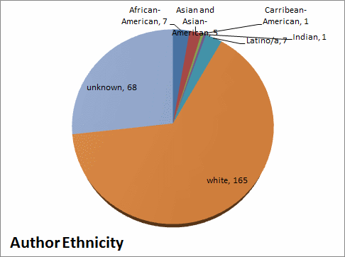 I feel like I did pretty well for gender split on my authors, but even though I was actively trying to read diverse books, I feel like it doesn’t really show in these author stats. Part of that is that many of the books I counted as diverse had diverse characters, but not necessarily diverse authors. Part of it is that most authors don’t announce their heritage in their bios – I went by clues from names and photos, which can be misleading – you’d never know my husband is part Asian by his name, nor my kids by their faces. But part of this, of course, is that I need to work harder at finding, reading, and reviewing diverse authors.