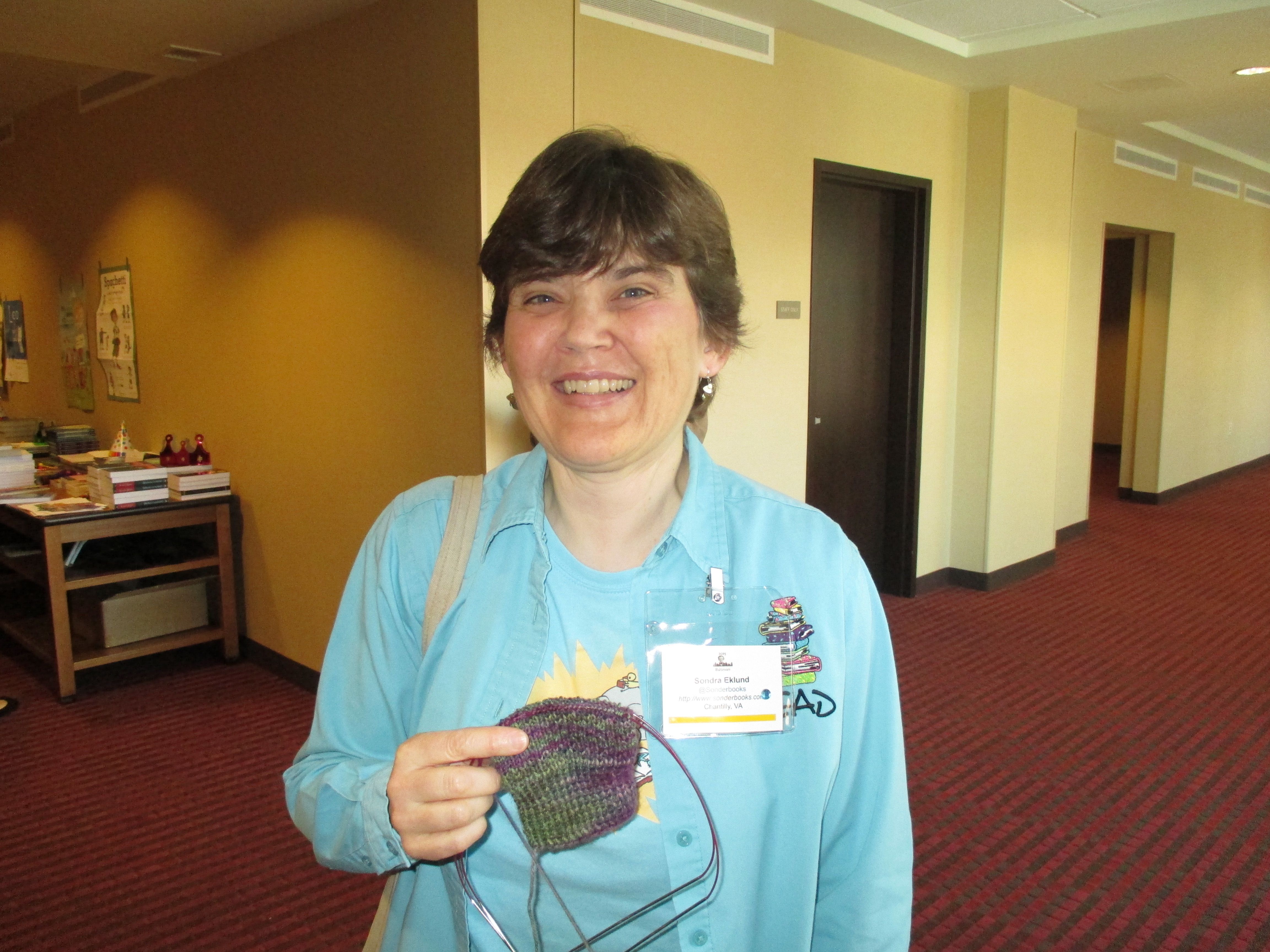 Kidlitcon is a cozy conference, with only about 100 people attending, mostly librarians, teachers, and authors, with a small sprinkling of enthusiastic readers who blog about children’s literature without doing it as a career. It is (as I had previously been told) the perfect conference for introverts. There are no large groups coming from libraries, but it’s easy to get to know everyone there without being intimidated because there are just a small number of people, all of whom are happy to talk about books. There was no giant room full of vendors, just a set of tables in the hallway outside the meeting room filled with publisher and author donations. All of the authors and illustrators I talked to were happy not only to autograph books but also to let me photograph them holding my knitting project. Both of the keynote speakers went to other sessions and hung out with the rest of the attendees at mealtimes.