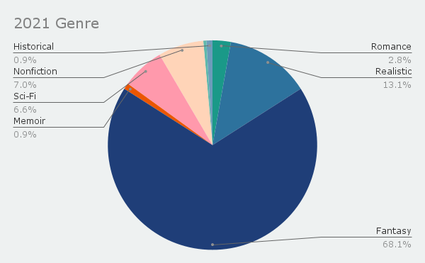 76% books by women is up 5% from last year. I did read trans authors this year, but recorded them as their preferred gender, so they don’t show up here. Nonbinary is a tiny count, but the first year it’s shown up at all. I can still do better.