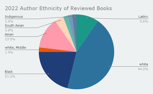 Graph of my 2022 author ethnicity - 55% white, 8% Latinx, 4% South Asian, 1.4% Indigenous, 14% Asian, 2-3 author teams of varying ethnicities.