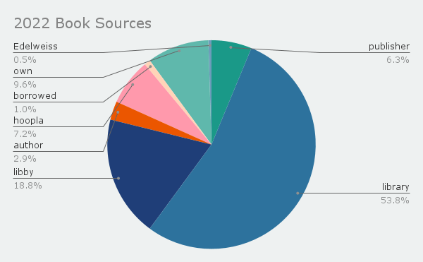 For the second time, I split out the print library books from the library ebooks. Total library usage was 79.8%, up 3% from 2021. Review copies totaled 9.7%, just slightly more than books I purchased for myself.