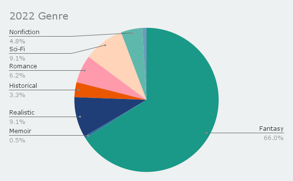 Fantasy still far in the lead, as usual, with jumps in Romance and Sci-Fi. 2022 needed lots of escapist reading!