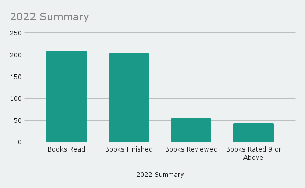I read 209 books in 2022, finishing 204 of them. I reviewed just 55 of them –